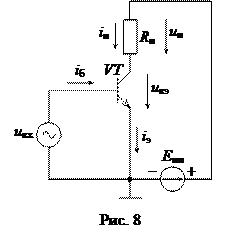 Задание. На вход усилителя на биполярном транзисторе поступает синусоидальное напряжение частотой f = 1000 Гц с амплитудным значением U вх.m. Для заданной схемы транзисторного усилительного каскада (рис. 7) на семействе выходных ВАХ построить линию нагрузки по постоянному току (ЛНПТ) и временные диаграммы токов, протекающих через все элементы схемы и напряжений на элементах с указанием на графиках их амплитудных значений.