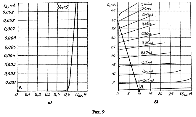 На рис. 9, а и б изображены входная и семейство выходных ВАХ транзистора КТ315А. Параметры транзистора: высокочастотный кремниевый эпитаксиально-планарный транзистор малой мощности n-p-n- типа; U кэ.max = 25 В; I к.max = 100 мА; P к.max = 150 мВт; h 21э = 20…90; I кбо = 1 мкА; U кэ.нас = 0,4 В; T к = 373 оК. Построим на семействе выходных ВАХ транзистора (рис. 9, б) ЛНПТ по двум точкам: I к = 0, U кэ = E ип = 10 (В) – первая точка линии; при U кэ= 0, Поскольку смещение рабочей точки отсутствует (нет источника в цепи базы), то ток базы покоя равен нулю I б0 = 0, и следовательно, ток коллектора покоя тоже близок к нулю I к0 = 0. Тогда постоянная составляющая напряжения коллектор-эмиттер в режиме покоя U кэ0 = 10 (В). Рабочая точка «A» транзистора, соответствующая режиму покоя, указана на обеих ВАХ (рис. 9). На выходной ВАХ выполнено дополнительное построение линии, которая соответствует току базы I бm(+) = 12 (мкА) при амплитудном значении положительной полуволны входного напряжения. Пересечение этой прямой с ЛНПТ определяет соответствующее амплитудное значение коллекторного тока, а следовательно и тока нагрузки I кm(+) = I нm(+)» 1 (мА). На выходной ВАХ этому току соответствует амплитудное значение напряжения U кэm(+)» 9,5 (В).