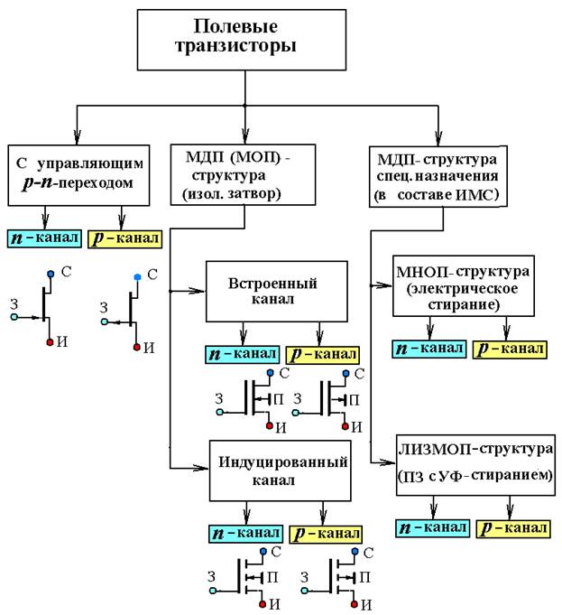 Рис.1.20. Структуры полевых транзисторов: а) ПТ МДП-типа с индуцированным р -каналом; б) УГО ПТ МДП-типа с индуцированными n- и р -каналом; В) МНОП-структура с изолированным затвором; Г) ЛИЗМОП-структура с плавающим затвором.