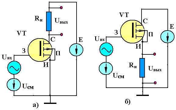 Рис.1.22. Схемы включения МДП ПТ с индуцированным р- каналом: А) с общим истоком; б) с общим стоком.