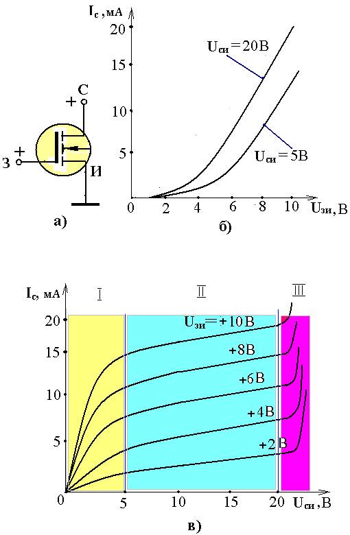 Рис.1.24. ВАХ ПТ МДП-типа с n -каналом: А) УГО ПТ; б) входная ВАХ; в) выходная ВАХ.