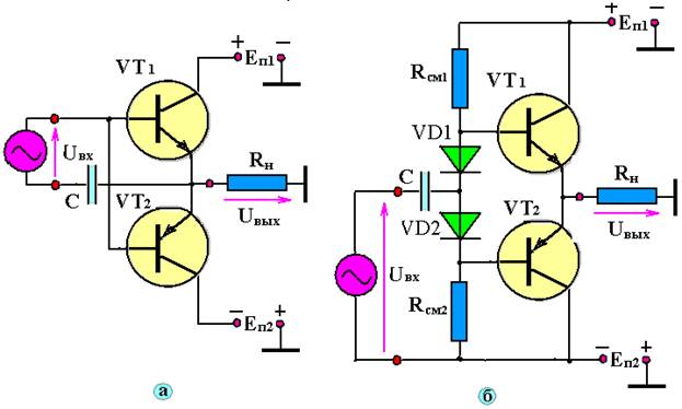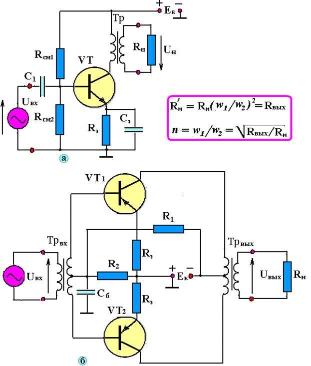 Рис.2.21. Схемы УМ с трансформаторной связью: А)однотактного (режим А); б) двухтактного (режим В или АВ).