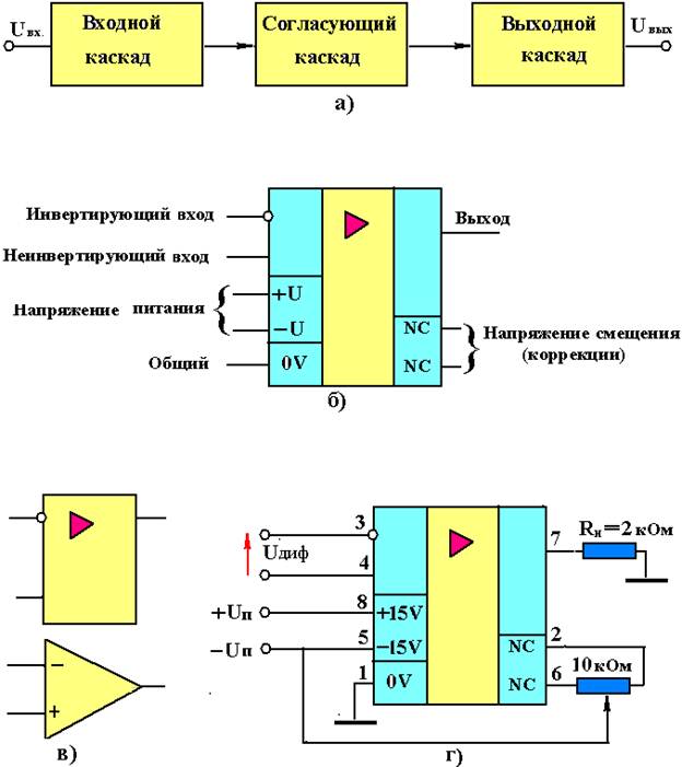 Рис. 3.1. Общие сведения об операционных усилителях: А) общая структурная схема ОУ; б) назначение выводов; Date: 2015-05-09; view: 1329; Нарушение авторских прав |