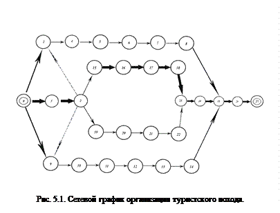 Сетевой график включает следующие события: 1 – Определен состав группы и распределены обязанности. 2 – Определен руководитель группы (выбирается членами группы или назначается). 3 – Проведен анализ и обобщение имеющейся информации – получены карты, кроки. 4 – Выбран район и сроки проведения походы. 5 – Разработан основной маршрут группы. 6 – разработаны запасные и аварийные варианты маршрута. 7 – составлен календарный график похода, определены контрольные пункты и сроки. 8 – Получены подтверждения МЧС (администрации района) о возможности проведения похода. 9 – Составлен список группового снаряжения. 10 – Составлен список личного снаряжения. 11 – Составлен список продуктов питания. 12 – Подготовлено и испытано групповое снаряжение. 13 – Подготовлено и испытано личное снаряжение. 14 – Подготовлены и опробованы продукты питания. 15 – Завершена общетуристская подготовка членов группы. 16 – Завершена техническая подготовка. 17 – Завершена тактическая подготовка. 18 – Завершена подготовка по технике безопасности. 19 – Завершена топографическая подготовка. 20 – Завершена физическая подготовка. 21 – Завершена специальная подготовка. 22 – Завершена психологическая подготовка. 23 – Завершена интегральная подготовка (участие в соревнованиях, тренировочные походы). 24 – Завершен врачебно-педагогический контроль. 25 – Разработана маршрутная документация – заполнена маршрутная книжка. 26 – Получено разрешение маршрутно-квалификационной комиссии. 27 – Группа выехала в район похода. В сетевом графике выделен критический путь (наибольшей продолжительности), проходящий через события (15-18) тактико-технической подготовки и обеспечения безопасности в процессе организации туристских походов, часто бывает, что критический путь связан с материально-технической подготовкой (события 9-14). Рассмотрим основные работы, предшествующие определенным событиям. Работа 0-1 связана с формированием группы (команды). В этой работе можно выделить четыре проблемы. Первая проблема связана с выполнением требований правил проведения соревнований спортивных походов, путешествий и организации спортивных туров по туристскому опыту. Вторая проблема – комплектование группы единомышленников по отношению к цели похода и средствам достижения цели. Третья проблема – психологическая совместимость участников группы. Четвертая проблема – формирование группы участников похода примерно равных по функционально-физической подготовленности. Решая первую проблему определяют численный состав группы, зависящий от вида туризма и категории сложности похода. В правилах оговаривается только минимальный состав группы. Например, для любых походов высшей категории сложности, минимальный состав группы – 6 человек, а для походов 1-2 категории сложности (кроме лыжных, горных и водных на байдарках-двойках) может быть уменьшен до двух человек в зависимости от конкретного маршрута и района похода. Максимальный состав группы правилами не установлен и должен быть ориентирован на здравый смысл руководителя группы. Обычно спортивная группа по условиям обеспечения безопасности не превышает 12 человек и в редких случаях несложных походов в условиях необходимости достигает 20 человек. Общая идея требований к туристско-спортивному опыту участников опирается на принцип постепенности 