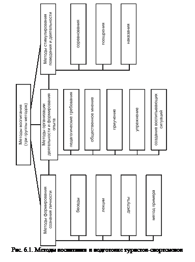 Туристская подготовка представляет собой процесс формирования системы знаний, умений, навыков (ЗУН), необходимых для занятий спортивным туризмом и совершенствования в этом виде спорта. По своей сути – это процесс повышения уровня подготовленности туристов к преодолению естественных препятствий в условиях спортивных туристских походов и соревнований по туристскому многоборью. Туристская подготовка может рассматриваться как многолетний процесс спортивного совершенствования или сравнительно кратковременный период предпоходной подготовки в соответствии с периодизацией тренировочного процесса. Следует отметить, что подготовка высококвалифицированного туриста – многолетний процесс. Термин «подготовка туриста» частично совпадает с термином «тренировка туриста», однако, является понятием общим. Подготовка туриста включает в себя и тренировку, как основное средство подготовки туриста, и целый ряд факторов, дополняющих тренировку. По существу это педагогический процесс воспитания туриста. В подготовке туристов-спортсменов используются различные методы воспитания и обучения, представленные на рисунках 6.1 и 6.2 (Бабанский Ю. К., 1983). Все указанные методы используются в сочетании, обеспечивающем качество подготовки туристов. Из методов воспитания особое внимание следует обратить на группу методов организации деятельности и формирования опыта. Из методов обучения особого внимания заслуживают методы организации учебно-познавательной деятельности. Все методы воспитания и обучения требуют определенного осмысления для использования тренером-преподавателем спортивного туризма. Например, методы воспитания, оставаясь общепедагогическими, отличаются по содержанию в разных видах воспитания – физическом, нравственном, эстетическом, трудовом – которые должны реализовываться в подготовке туристов. При подготовке туристов следует обратить внимание на то, что методы обучения по логике передачи и восприятия информации должны дополнять друг друга. В частности техническая подготовка часто осуществляется в последовательности «от общего к частному и от частного к общему». Это связано с необходимостью общей демонстрации технического приема, дальнейшего расчленения технического приема для обучения по частям и, наконец, полного исполнения технического приема с устранением ошибок обучающихся. Спортивный туризм развивает и совершенствует необходимые человеку физические качества – выносливость, быстроту, силу различных групп мышц, ловкость. Кроме того, в туристских походах совершенствуются морально-волевые качества, такие как смелость, решительность, дисциплинированность, коллективизм, активность, воля и др. Все эти качества должны вырабатываться и развиваться в учебно-тренировочном процессе. Достижение высоких спортивных результатов в туризме возможно при решении основных задач учебно-тренировочного процесса: обеспечения всестороннего физического развития; воспитания высоких моральных качеств; овладения туристской техникой и тактикой; приобретения необходимых знаний по основам теории, методики и организации физического воспитания и спортивной тренировки; совершенствования спортивного мастерства. Эти задачи нужно решать комплексно на всех учебно-тренировочных занятиях. Они обязательны для всех турист