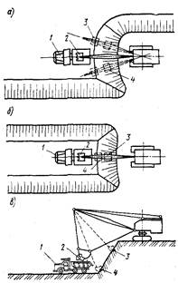 Экскаваторы с обратной лопатой три разработке грунта могут передвигаться вдоль и поперек котлована, а также зигзагом (рис. 1.3). Экскаваторы-драглайны используют для разработки грунтов мягких и средних пород, преимущественно при отрывке котлованов и траншей, расположенных ниже уровня стоянки экскаватора, при возведении насыпи и выемок, в качестве погрузочного средства три выполнении вертикальной планировки и др. Экскаваторы-драглайны обладают большим радиусом действия и глубиной копания. Земляные работы с помощью драглайнов могут производиться с выгрузкой грунта в отвал или непосредственно в насыпь, а также в транспортные средства. В последнем случае автотранспорт в зависимости от условий работы может перемещаться как по верху разработки, так и по подошве забоя. При организации подачи автотранспорта по подошве забоя применяют поперечно-челночный или продольно-челночный способ погрузки грунта (рис. 1.4, а, б, в). При поперечно-челночном способе набор грунта производят поочередно с каждой стороны автотранспорта и разгрузка ковша происходит без остановки поворота стрелы при положении ковша над кузовом автомашины. Автосамосвалы подают по оси дна выемки экскаваторной проходки. При продольно-челночном способе набор грунта и его разгрузку производят со стороны заднего борта автотранспорта. Ковш экскаватора при этом совершает только возвратно-поступательные движения, а платформа не поворачивается, что позволяет значительно сократить рабочий цикл экскаватора и повысить его производительность. Экскаваторы-драглайны, так же как и экскаваторы с обратной лопатой, при разработке грунта могут передвигаться вдоль и поперек котлована, а также зигзагом (см. рис. 1.3). Экскаватор, оборудованный грейфером, используют при разработке мягких и сыпучих грунтов в отвал и в транспортные средства, при разработке котлованов под отдельные колонны, фундаменты силосных башен, опор линий электропередач, а также для рытья колодцев, глубоких и узких траншей и др.