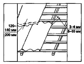 При устройстве деревянных оснований (обрешетки): - стыки обрешетки следует располагать вразбежку; - расстояния между элементами обрешетки должны соответствовать проектным; - в местах покрытия карнизных свесов, разжелобков и ендов, а также под кровли из мелкоштучных элементов основания необходимо устраивать из досок (сплошными). Напуск вышележащего ряда на нижележащий для асбестоцементных листов: - ВО, СВ - 120 - 140 мм; - УВ, ВУ - 200 мм. Крепление асбестоцементных листов к обрешетке: - листы ВО и СВ следует крепить шиферными гвоздями с оцинкованной шляпкой; - листы УВ и ВУ - винтами со специальными захватками; - плоские листы - двумя гвоздями с противоветровой кнопкой. Не допускаются: - отколы и трещины в асбестоцементных листах; - видимые просветы в покрытии при осмотре кровли из чердачных помещений. Требования к качеству применяемых материалов ГОСТ 30340-95. Листы асбестоцементные волнистые. Технические условия ГОСТ 18124-95. Листы асбестоцементные плоские. Технические условия. Листы и детали не должны иметь на лицевой поверхности трещины, сколы и посторонние включения. Допускаемые дефекты лицевой поверхности