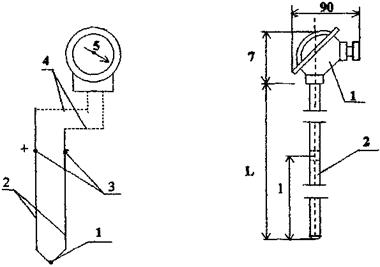 Необходимо знать, что наиболее распространены термопары стандартных градуировок: ПП (платинородий – платина), ХА (хромель – алюмель), ХК (хромель – копель) и др. Платинородий – платиновые термопары применяют для измерения среды температурой до 1600 С; хромель – алюмелевые – до 1000 и кратковременно до 1300 °С; хромель копелевые – до 600 и кратковременно до 800 °С. Конструкция термопары показана на рис. 1.3. Электроды изолируют друг от друга фарфоровыми трубками и помещают в защитный чехол 2. Он в зависимости от температуры среды изготавливается из фарфора, карборунда, жароупорной стали. В головке термопары 1 помещают пластмассовую или фарфоровую панель с клеммами. Изнутри к клеммам подключены электроды – термопары, а снаружи соединительные или компенсационные провода. Для измерения высоких температур применяют термопары из тугоплавких материалов, например, вольфраммолибденовые, вольфраморениевые и другие. Измерение температуры термометрами сопротивления основано на свойстве некоторых материалов изменять электрическое сопротивление в зависимости от температуры. Термометры сопротивления бывают металлические и полупроводниковые. Чувствительный элемент металлического термометра сопротивления представляет собой тонкую проволоку диаметром 0,05…0,1 мм, намотанную на каркас из изоляционного материала, например, кварца, пластмассы, либо помещенную в виде спирали в керамический каркас с заполнением спирали изолирующим порошком и последующей герметизацией чувствительного элемента. Изготовленные таким образом чувствительные элементы помещаются в защитный чехол, который затем погружается в измеряемую среду (рис. 1.5). Чувствительный элемент полупроводникового термометра сопротивления, представляет собой кристалл полупроводникового материала, как правило, герметизированный в стеклянном или металлическом чехле небольших размеров. В комплекте с термометрами сопротивления используются логометры и автоматические уравновешенные мосты. Термометры сопротивления изготавливают из платины (ТСП) и из меди (ТСМ). Область применения технических платиновых термометров сопротивления от – 260 до + 1100 °С, например, термометры сопротивления типа ТСП-5071 применяют в интервале температур – 200... + 750 °С. Медные термометры сопротивления применяют для измерения температур в интервале – 50... +150 °С. Полупроводниковые термометры сопротивления выпускаются для измерения температур в диапазоне от 1 до 600 К. Следует знать, что в промышленности применяются четыре разновидности пирометров, измеряющих температуру по тепловому излучению тел. Измерение температуры тел пирометрами излучения осуществляют бесконтактным способом, т.е. на расстоянии. Все пирометры градуируются по абсолютно черному телу. При этом величина излучения реального тела отличается от излучения абсолютно черного тела. Это отличие выражается коэффициентом излучения или степенью черноты тела. Возможность определения температуры тел с различной степенью черноты при помощи одного и того же прибора достигается градуировкой прибора при температуре абсолютно черного тела. Такой способ градуировки приводит к получению заниженных результатов. Действительную температуру определяют введением поправок на неполноту излучения реального тела по сравнению с абсолютно черным телом. Пиром