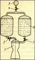 В результате реакции горения происходит преобразование первичной (химической) энергии топлива в энергию теплового движения (в теплоту), в результате чего образуются газообразные продукты сгорания, обычно имеющие высокую температуру. Ускорение продуктов сгорания в сопле камеры вследствие преобразования их теплоты в кинетическую энергию приводит к созданию реактивной силы. Жидкостной ракетной двигательной установкой, или более кратко двигательной установкой, называют установку, состоящую из одного или нескольких ЖРД, пневмогидравлической системы подачи топлива и вспомогательных устройств. На рис. 1.1 изображена упрощенная схема ДУ с ЖРД. Двигательная установка состоит из камеры 1, баков компонентов топлива 3 и 6, клапанов компонентов топлива 2 и 7, баллона со сжатым газом 5 и пневмоклапана 4. При открытии последнего сжатый газ поступает из баллона в баки, в результате чего давление в них возрастает. При открытии клапанов 2 и 7 компоненты топлива (окислитель и горючее) начинают поступать в камеру, и в ней начинается процесс горения с истечением продуктов сгорания из сопла.