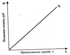 Рис. 1. Кривая предложения услуг Рис. 2. Рыночная кривая предложения труда индивидуальной рабочей силы На Рис. 1 отражена ситуация, когда замещение часа досуга часом труда стимулируется повышением часовой ставки (W). Но эффект замещения в точке Е при величине почасовой ставки WE сменяется эффектом дохода, т. е. дальнейшее повышение почасовой ставки не стимулирует увеличение труда индивида. Но в обществе всегда найдутся люди, которые при более высокой почасовой ставке будут готовы предоставить услуги труда (Рис.2). ЗАРАБОТНАЯ ПЛАТА Заработная плата -это плата работнику за труд, за использование его рабочей силы. Основные факторы, определяющие размер заработной платы: 1. Стоимость рабочей силы - это стоимость средств обеспечения жизни и трудоспособности работника (затраты на удовлетворение материальных и духовных потребностей самого работника и его семьи, а также расходы на его профессиональное обучение). 2. Количество и качество труда. В современной экономике в отношении наёмной рабочей силы действует принцип распределения по труду, который ставит размер оплаты в зависимость от конечных результатов работы (сколько, как и какого качества продуктов произведено). Отсюда: каждый работник должен получить от общества то, что он сам дал обществу. 3. Рост производительности труда - имеет свои тонкости. Ведь рост производительности труда - результат усилий не только данного работника, но и многих других людей: предпринимателя (идеи, инвестиции, риск); менеджеров и инженеров (организация, управление, технологии); общества в целом (наука, образование, инфраструктура и пр.). Поэтому и полученный здесь выигрыш должен проявиться не только в приросте зарплаты, но и в снижении производственных затрат и цен, в повышении доходов предпринимателя и остальных участников хозяйственного процесса. 4. Квалификация работника и характер труда - более высоко оплачиваются сложный, требующий длительного обучения, а также малопривлекательный труд. 5. Конъюнктура на рынке труда: соотношение между спросом и предложением рабочей силы, острота конкуренции между соискателями вакансий, положение с безработицей, и пр. 6. Степень обобществления (социализации) заработной платы. В современных обществах не вся заработанная сумма денег поступает трудящимся сразу в виде индивидуальной выплаты. Часть её через отчисления государству идёт в общественные фонды потребления (ОФП) - на пенсионное гособеспечение и помощь живущим в нужде и пр. 7. Национальность, пол, религия. Дифференциация ставок зарплаты по подобным признакам есть не что иное, как недопустимая дискриминация работников в оплате их труда. Но таковая, к сожалению, во многих государствах скрыто или явно и в разной мере всё ещё сохраняется. ВИДЫ, ФОРМЫ И СИСТЕМЫ ЗАРАБОТНОЙ ПЛАТЫ Деление оплаты труда на эти два вида связано с налогами и инфляцией. Номинальная заработная плата - это сумма денег, получаемая работниками в качестве платы за труд. Её, в свою очередь, можно разделить на (а) зарплату начисленную (до выплаты налогов) и (б) зарплату выплаченную (за минусом уплаченных налогов). Номинальная заработная плата (начисленная) включает ещё не выплаченные налоги и не учитывает динамику цен, поэтому по ней нельзя судить о действительном уровне потребления трудящихся. Фактический же уровень потребления благ за конкретный 