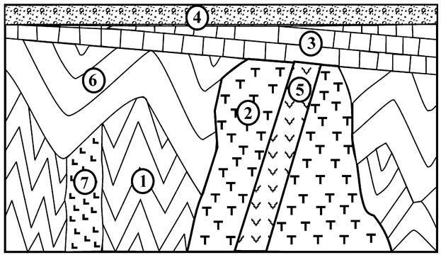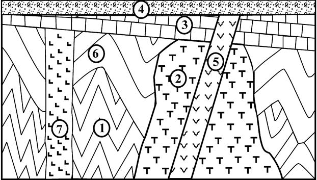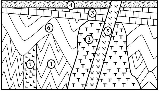 На основе анализа геологического разреза участка земной коры (вариант берется по последней цифре шифра) Задача: Определить последовательность образования горных пород на основе анализа геологического разреза. Записать результат в виде последователь- ного ряда чисел, соответствующих указанным на рисунке номерам (от древних к молодым). Методика выполнения: По характеру пересечений разных групп осадочных и магматических пород вначале определить наиболее молодые образования, которые рассе- кают все остальные породы. Далее следует найти среди пород те, которыерассекаются самыми молодыми породами, но, в свою очередь, пересекают все остальные слои. И так далее. Наиболее древними породами будут те, которые пересекают все остальные группы пород. Исходный материал: Вариант 1