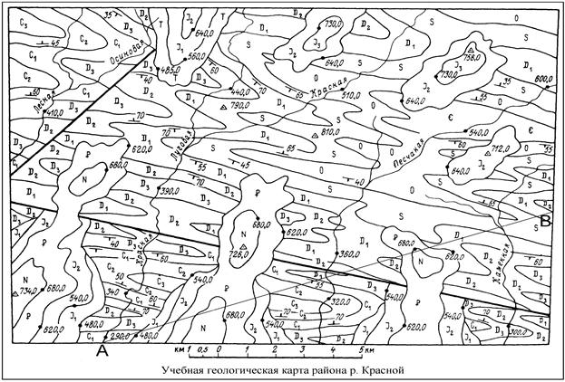 (вариант берется по последней цифре шифра) Задача: Построить геологический разрез по линии А–Б Методика выполнения: 1. Для наглядности и удобства построения разреза прилагаемую геоло- гическую карту можно раскрасить, обозначив каждый из слоев соответст- вующим цветом. Для самостоятельной работы по чтению геологической карты и составлению геологических разрезов рекомендуется использовать карту, на которой необходимо предварительно раскрасить все геологиче- ские образования (слои) согласно общепринятой геохронологической (стратиграфической) шкале, либо палитра цветов может быть произволь- ной. Построение геологического разреза производится на отдельном листе бумаги. Линия топографического профиля должна быть расположена с тем расчетом, чтобы сверху было достаточно места для написания заголовка геологического разреза, а снизу – для написания и построения линейного графического масштаба, условных обозначений, подписи исполнителя и даты построения разреза. Концы топографической кривой, а соответст- венно и разрез следует ограничить вертикальными прямыми, на которых необходимо построить вертикальные масштабные линейки с обозначением делений относительно абсолютного гипсометрического нуля (уровня мо- ря). Построив топографический профиль (или проведя горизонтальную ли- нию поверхности плоского рельефа), следует нанести на него точки выхо- дов границ различных стратиграфических подразделений, полученные от пересечения геологических границ линий разреза. Для этого, пользуясь циркулем-измерителем, необходимо от одной из начальных точек линии разреза последовательно перенести с карты на профиль ширину полос вы- хода слоев на поверхность (расстояния между границами слоев) и точки выхода сместителей разрывных нарушений. Каждый раз ширину выхода пород или положение других точек необходимо замерять циркулем от од- ной начальной точки разреза, а не от предыдущей точки выхода. Этим дос- тигается бо'льшая точность построения разреза. Выходы границ слоев и сместителей разломов можно изображать на линии профиля и другим способом, нанося их сначала на край узкой по- лоски бумаги, приложенной к линии разреза на карте, а затем перенося эти точки на кривую топографического профиля. При этом необходимо, чтобы крайние точки линии разреза и топографического профиля совпадали меж- ду собой. Между точками выхода слоев на разрезе для лучшей ориенти- ровки полезно проставлять возрастные индексы пород, особенно в тех слу- чаях, когда по линии разреза выходит большое количество слоев, часто с различным падением. 2. В качестве вспомогательных данных для построения разреза можно нанести на топографическую кривую точки выхода осевых поверхностей складок, помечая над разрезом осевую поверхность антиклинальной складки скобкой, изогнутой вверх, а синклинальной – вниз. Построение разреза, т. е. нанесение границ слоев и линий разрывных нарушений, сле- дует начинать с тех участков, где лучше всего выявляются формы складок и на карте имеются данные о падении слоев. Пользуясь элементами зале- гания пород, на геологическом разрезе показывают соответствующие на- клоны границ слоев, но так, чтобы мощность каждого отдельного слоя не менялась по всему его простиранию. На тех участках разреза, где нет дан- ных об углах падения, наклон слоев следу
