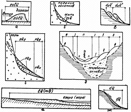 Четвертичные отложения залегают непосредственно на поверхности земли, перекрывая более древние и мощные дочетвертичные отложения морского генезиса. Четвертичные отложения в основном являются континентальными и по механизму образования подразделяется на различные генетические типы, обладающие разнообразным составом и формами залегания. Четвертичные отложения имеют в основном песчано-глинистый состав, который может сильно варьировать по площади и разрезу, а также небольшую мощность (метры, десятки метров), которая может быстро изменяться вплоть до выклинивания. На поверхности земли четвертичным отложениям часто соответствуют: определённые формы рельефа: речные террасы, барханы, склоны, конусы выноса, оползневые ступени и т. д. Рассмотрим генетические типы четвертичных отложений. Элювий (элювиальные отложения, кора выветривания) — eQ(elQ). [Выветриванием называется воздействие на породу всех факторов внешней среды: Солнца, воды, воздуха, растений, микроорганизмов и т. д.] При горизонтальном рельефе продукты выветривания не уносятся водой, а сохраняются на месте образования, поэтому форма залегания элювия близка к горизонтальной. Состав элювия изменяется по глубине: с поверхности залегают глины с дресвой или щебнем, в нижней части элювий представлен щебнем и глыбами. [Переход элювия трещиноватой породе постепенный.] Эоловые (ветровые) отложения — vQ (eolQ). Образуются при накоплении материала, переносимого ветром. Состав: эоловые пески, лёсс, вулканический пепел. [Форма залегания по подошве повторяет нижележащий рельеф, а по поверхности в рельефе могут образовываться барханы (рис. а).] Делювий — dQ (dlQ). Образуется в результате накоплении на склоне тонкого песчано-глинистого материала, приносимого сверху дождевыми и талыми водами. [На пологих склонах преобладают супесчано-суглинистые отложения, на более крутых склонах горных стран — супесчано-щебнистые отложения (горный делювий). Мощность делювия увеличивается вниз по склону от долей метра до 5-10 м и более.] Форму залегания часто именуют чехлом или шлейфом (рис, ж). Пролювий (конусы выноса) — рQ(plQ). Образуется в результате отложения в предгорьях материала, приносимого с гор мелкими реками и временными водотоками. В верховьях конусов выноса откладываются крупные обломки — галечник, гравий, а в средней и нижней части — песчаный и глинистый материал (рис., г). [Мощность пролювия, наибольшая в вершинной зоне, колеблется от нескольких метров до десятков и даже сотен метров. Если на одной территории распространено два конуса выноса, это значит, что более молодой наложен на более древний.] Озёрные — lQ, морские — mQ и болотные — hQ отложения. Залегают горизонтально (рис., е). Для влажного климата характерны следующие озёрные отложения: терригенные (от глин до галечников) и органогенные осадки, для засушливого климата — хемогенные осадки. Аллювиальные (речные отложения) aQ (alQ) — это отложения всех русловых водных потоков, включая и временные потоки. Среди аллювиальных отложений выделяются русловая, пойменная и старичная фации. Русловая фация представлена сортированными гравийно-песчаными косослоистыми отложениями (на равнине) или галечниками (в горах). Пойменная фация представлена маломощным покровом супесей и суглинков с линзами песка. Старичная фация состоит из алеврито-глинистых от
