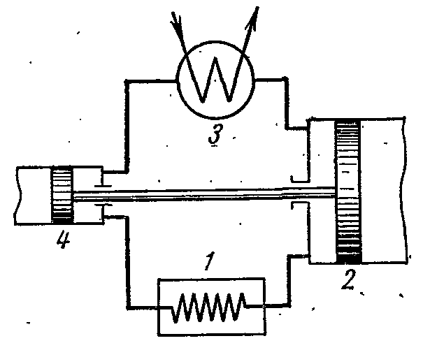 На рисунке изображена схема воздушной холодильной установки, где в качестве рабочего тела применяют воздух, являющийся наиболее удобным, безвредным и доступным рабочим телом. Воздушная холодильная установка работает следующим образом. Воздух, охлаждающий помещение 1, сжимается в компрессоре 2, в результате чего температура его увеличивается. Сжатый воздух при постоянном давлении нагнетается в теплообменник 3, в котором охлаждается водой до температуры окружающей среды. После этого сжатый воздух поступает в расширительный цилиндр, или детандер 4, где расширяется до начального давления. При расширении температура воздуха падает до -60 или -700С и холодильный воздух направляется для охлаждения помещения, где, нагреваясь, опять поступает в компрессор.
