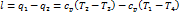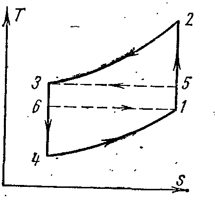 в pv – и Ts – диаграммах: воздух в процессе 1-2 адиабатно сжимается от давления p1 до p2. В изобарном процессе 2-3 от воздуха отводится удельное количество теплоты внешнему источнику и температура его понижается от T2 до Т3. При адиабатном расширении в процессе 3-4 воздух дополнительно охлаждается от температуры Т3 до Т4. Далее в изобарном процессе 4-1 происходит отвод теплоты от охлаждаемого помещения (теплоотдатчика), в результате чего воздух нагревается от Т4 до Т1. Работа затрачиваемая на осуществление цикла, равна разности удельных количеств теплоты q1 и q2. Считая теплоёмкость постоянной имеем:
