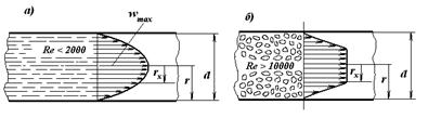 Рис. 17.2.. Схема распределения скорости по сечению трубы при ламинарном а) и турбулентном б) течении жидкости