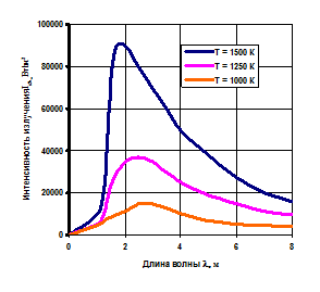 Рис. 18.1. Графическая зависимость изменения интенсивности излучения абсолютно черного тела от длины волны и температуры (к закону Планка)