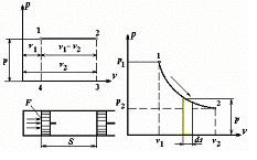 В цилиндре под поршнем находится газ при давлении p, равном в равновесном процессе давлению среды, и удельном объеме v 1; площадь поршня F. Если сообщить газу некоторое количество теплоты, то он будет расширяться при постоянном давлении и перемещать поршень до положения в точке 2. Сила, действующая на поршень, равна pF, путь перемещения поршня равен S. Работа, совершаемая газом при перемещении поршня, равна l = pFS, но произведение FS есть разность удельных объемов v 1- v 2, поэтому l = p ×(v 2 - v 1) = p ×D v. (4.3) Элементарная работа dl, совершаемая системой в равновесном процессе изменения состояния газа, при бесконечно малом изменении объема, определится по формуле dl = pdv. (4.4) Полная работа l, совершаемая системой при бесконечно малом изменении объема в произвольном равновесном процессе, изображается кривой 1 - 2 и равна