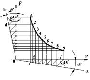 Эта зависимость является уравнением адиабатного процесса. (Построение в координатах pv кривой, соответствующей этому уравнению, может быть произведено графическим способом, показанным на рис. 6.3. Пусть дана точка 1 с известными параметрами р 1 и v 1. Проведем из начала координат О луч Оа под произвольным углом a к оси абсцисс. Для получения достаточного количества точек, особенно для начальной части кривой, прилегающей к точке 1, угол a следует брать порядка 10-15°. Под углом b к оси ординат проведем второй луч Ob. Угол a зависит от угла b и вычисляется по формуле (1 + tg b) = (1 + tg a)k. (6.23) Затем из точки 1 проведем горизонталь 1с влево и вертикаль 1е вниз и построим под углом 45° от точки пересечения горизонтали 1с с осью ординат луч cd и вертикали 1е с лучом Оа - луч ef, как показано на рис. 6.3. Проведя вправо из d горизонталь и из точки f вертикаль вверх, на их пересечении получим точку 2, принадлежащую искомой адиабате. Аналогично строятся точки 3, 4 и т. д.).