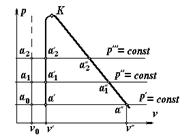 Температура насыщения увеличивается с повышением давления. При дальнейшем подводе теплоты к сухому насыщенному пару при постоянном давлении происходит увеличение температуры и удельного объема. В таком состоянии пар называется перегретым. Т.о. перегретым называется пар, у которого при данном давлении температура выше температуры насыщения. Удельный объем перегретого пара обозначается v, а температура t. В области перегретого пара изобара не совпадает с изотермой. Если воду нагревать при других более высоких давлениях Соединив между собой точки а одинакового состояния, получим три линии. Первая, проходящая через точки а о - а 2 представляет собой состояние не кипящей воды при температуре t = 0°С, вторая называется нижней пограничной кривой при x = 0. Она отделяет область жидкой фазы от области насыщенного пара. Третья линия выражает собой состояния перегретого насыщенного пара. Эта линия называется верхней пограничной кривой (х = 1), она отделяет область насыщенного пара от области перегретого пара. Точка К является критической точкой. Ей соответствует критическое давление водяного пара 22,129 МПа и критическая температура T = 273,16 K (373,16°C) и критический объем v к = 0,00326 м3/кг.