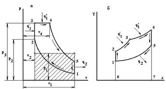 Рис. 10.4. Цикл ДВС со смешанным подводом количества теплоты (в процессах а -