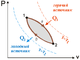 В процессе 1а2 к рабочему телу от горячего источника температурой Т1 подводится теплота Q1 и совершается положительная работа. В процессе 2b1 от рабочего тела к холодному источнику температурой Т2 отводится количество теплоты Q2 и совершается отрицательная работа. Количество работы в процессе расширения L1a2, больше, чем работа сжатия L2b1, и цикловая работа будет положительна и равна: На рисунке работа цикла изображается площадью фигуры пл.1-а-2-b-1. В соответствии с первым законом термодинамики для цикла: Для оценки эффективности преобразования теплоты в работу в прямом цикле используют термический коэффициент полезного действия (КПД), под которым понимают отношение работы, полученной в цикле, к затраченной теплоте: Таким образом, термический КПД показывает какая часть теплоты, подведенной к циклу от нагревателя, превращена в полезную работу. Согласно второму закону термодинамики эта величина всегда меньше единицы (<100%).