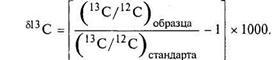 В качестве стандарта используется отношение 13С/12С в белемните мелового возраста формации Пи-Ди (PDB). Углерод известняков обычно более тяжелый по сравнению со стандартом, т.е. отличается более высокой концентрацией δ13C; органическое (биогенное) ОВ характеризуется более легким его составом, причем различные его компоненты также отличаются по соотношению изотопов. Изотопный состав углерода индивидуальных природных соединений определяется их генезисом: составом исходного вещества, степенью его разделения или фракционирования в тех или иных процессах. Глубина фракционирования контролируется прежде всего кинетическими и термодинамическими факторами. При нормальной температуре наиболее восстановленные соединения с углерод-водородными связями — метан, УВ нефти содержат больше легких изотопов, а высокоокисленные кислород-углеродные — СО2, СО — обогащены тяжелыми изотопами. Углерод карбонатов, как правило, тяжелее стандарта. В процессе фотосинтеза в углероде увеличивается содержание легких изотопов. Характер фракционирования также определяется температурой: при высокой температуре фракционирование минимальное. На рис 2.1 приведены пределы колебаний содержания δ13C в различных природных объектах. Из анализа приведенной схемы видно, что высоковосстанов-ленный углерод (метан) имеет резко различный изотопный состав: значения δ13C для биогенного метана и метана из срединной долины рифтовых зон отличается на 75‰. Углерод древнего докембрийского ОВ более легкий (δ13C = -29...—33‰), чем палеозойский, при этом углерод морского позднепалеозойского и мезозойского ОВ «легче», чем континентального. Для современного и плиоценового ОВ морского генезиса характерен более «тяжелый» изотопный состав (δ13C = —16...—23‰). Наземное ОВ того возраста обычно более «легкое» (δ13C = — 23...—33‰). В целом органический углерод осадочных толщ содержит δ13C меньше на 25‰, чем углерод карбонатов. Это обусловлено процессами фотосинтеза, при которых происходит очень широкое фракционирование изотопов. Дефицит δ13C служит показателем биогенного генезиса углерода, а «легкий» углерод карбонатов является показателем их генетической связи с трансформацией ОВ.