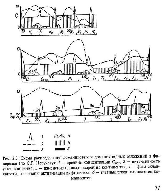 На рис. 2.2 приведено распределение масс Сорг начиная с отложений верхней юры. Максимальная масса Сорг отмечена для этложений К1 затем J3, причем для континентов и акваторий характер распределения сходен. Обогащенные Сорг прослои - доманикиты и доманикоиды — присутствуют практически во всех системах фанерозоя, отмечаются они и в докембрии. Отложения, обогащенные РОВ, прослеживаются на одних стратиграфических уровнях на разных континентах, они не совпадают с эпохами угленакопления. Распределение таких уровней в стратиграфическом разрезе фанерозоя при-зедено на рис. 2.3. Интересно отметить, что в докембрийских толщах контраст между кларковыми концентрациями и домани-коидными прослоями более резкий, в кайнозойских разрезах концентрации Сорг менее контрастны. Наиболее значимые по
