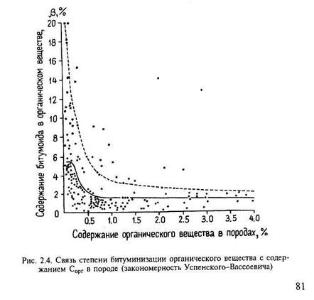 В.А. Успенским была установлена закономерность — увеличение роли битуминозных компонентов в ОВ пород при уменьшении его содержания. Н.Б. Вассоевич установил подобную обратную зависимость для ОВ современных осадков, она получила название закономерность Успенского-Вассоевича. Суть ее сводится к следующему: с увеличением дисперсности ОВ доля битуминозных компонентов в нем растет. Соблюдение этой закономерности (рис. 2.4) — надежный показатель автохтонности, или сингенетинности, битумоидов. Предпочтительнее использовать первый термин, хотя в литературе чаще употребляется второй. Термин «сингенетичный» подразумевает не только единство места образования, но и единство времени образования. В случае битумоидов речь идет только о генетическом единстве, т.е. единстве источника - места образования; время образования битумоидов, как правило, только частично соответствует време-