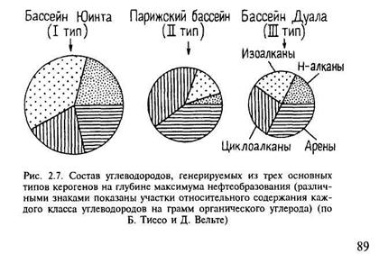 Первый тип — кероген с высоким содержанием водорода и низким кислорода (начальное атомное отношение Н/Сат высокое — более 1,5 и О/Сат низкое — менее 0,1); кероген в значительной части состоит из липидного материала, в нем преобладают алифатические структуры. Содержание полиароматических ядер и гетерогенных связей невелико. Кислород находится главным образом в сложноэфирных связях. Кероген формируется в основном за счет водорослевых и микробных липидов, он харак-терен для некоторых типов горючих сланцев: торбанитов, тасманитов, куронгитов, горючих сланцев «Грин Ривер». Этот тип ке-рогена распространен относительно редко. Второй тип — содержание водорода достаточно высокое, но меньшее, чем в первом типе, содержание кислорода более высокое; в керогене этого типа большое значение приобретают полиароматические ядра, гетероатомные группы кетонов, карбоксильные группы кислот и сложноэфирные связи. В нем обычно присутствует сера, локализуясь в гетероциклах. Кероген этого типа формируется в результате отложения и накопления морских организмов (фито- и зоопланктон, бактерии с участием принесенного в бассейн ОВ высших растений). Основная масса керогена в шлифах определяется как микстинит с примесью альгинита и витринита; его петрографический тип определяется как лейпти-нит. Этот кероген является источником УВ для большого числа нефтяных месторождений, в том числе и гигантских. Третий тип — кероген, бедный водородом (Н/Сат<1, О/Сат = 0,2-0,3), содержащие преимущественно конденсированные полиароматические ядра и кислородсодержащие функциональные группы при отсутствии сложноэфирных группировок. Характерны длинные алифатические цепочки, унаследованные от восков высших растений. Кероген этого типа образовался в основном из остатков наземной растительности. Обычен для континентальных окраин и дельтовых толщ. Выделенные типы керогенов отличаются по характеру генерируемых продуктов, и прежде всего УВ. Соотношение различных групп УВ дано на рис. 2.7.