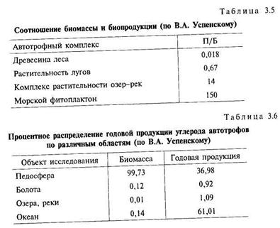 формирование которого происходит путем фотосинтеза, т.е. совокупностью биохимических реакций; в процессе формирования ОВ извлекает другие биогенные элементы в виде SiO2, СаСO3. Mg СO3 с некоторыми присущими им микроэлементами. Для всех фотосинтезирующих организмов реакции фотосинтеза идут согласно следующему уравнению: Фотосинтез в океане происходит в сравнительно тонком верхнем слое мощностью 2—250 м (в среднем 40 м) — эуфотическом слое — слое жизни. Разные фотосинтезирующие организмы используют различные участки видимого светового спектра, что позволяет фотосинтезирующим бактериям и водорослям обитать на различной глубине водной толщи. Соотношение автохтонного и аллохтонного ОВ изменяется в различных районах Мирового океана и на разных уровнях столба воды. По данным Е.А. Романкевича, в среднем в Мировом океане доля аллохтонного ОВ достигает 5% обшей массы ОВ; приводятся более низкие и более высокие значения. На шельфе и некоторых участках континентального склона аллохтонное ОВ может составлять значительную долю общего ОВ; в водоеме оно находится в растворенной и взвешенной (детритной) формах. В океане количество растворенного ОВ резко преобладает над взвешенным и является господствующей формой существования, но в донный осадок практически переходит только взвешенное ОВ. Б. Тиссо и Д. Вельте (1981), ссылаясь на Д. Мензеля, приводят следующие данные о соотношении этих форм ОВ. Вертикальное распределение детритного органического углерода (ДОУ) и растворенного органического углерода (РОУ) в океанах практически одинаково ниже глубины 200-300 м. Концентрация ДОУ изменяется от 2 до 10 мкг/л, а РОУ — от 350 до 700 мкг/л. Выше указанной глубины содержание этих компонентов изменяется, причем ДОУ прямо пропорционально, а РОУ обратно пропорционально величине первичной продукции органического вещества. Создаваемое в бассейне автохтонное ОВ представлено прежде всего фитопланктоном. При малых размерах основных представителей фитопланктона (микропланктон и наннопланктон) и ничтожной массе он отличается чрезвычайно высокой продуктивностью. В табл. 3.5 и 3.6 приводятся соотношения биомассы (Б) и биопродукции (П) для разных типов автотрофных комплексов по различным областям.