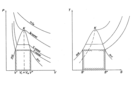 где Тн - температура насыщения, К. Из pv- и Тs -диаграмм видно, что с увеличением давления р точки b1, b2,… на нижней пограничной кривой сближаются с точками с1, с2, … на верхней пограничной кривой и в критической точке они сходятся. Для воды критические параметры в точке К имеют следующие значения: ркр. = 22,13 МПа, tкр. = 374,2 °С, vкр. = 0,00326 м3/кг. Выше критической точки К при p > pкр . и Т > Ткр . двухфазного состояния не наблюдается. Жидкая фаза находится под весьма большим внутренним давлением. Фактором, определяющим интенсивность межмолекулярных взаимодействий, является не давление, а температура. С ростом температуры и давления теплота парообразования r уменьшается, а в критической точке r = 0, называется кривой насыщения, рис. 3.