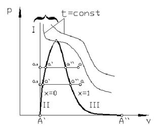 При дальнейшем подводе теплоты начинается кипение воды с сильным увеличением объема. В цилиндре теперь находится двухфазная среда – смесь воды и пара, называемая влажным насыщенным паром. По мере подвода теплоты количество жидкой фазы уменьшается, а паровой – растет. Температура смеси при этом остается неизменной и равной t s, так как вся теплота расходуется на испарение жидкой фазы. Следовательно, процесс парообразования на этой стадии является изобарно-изотермическим. Наконец, последняя капля воды превращается в пар, и цилиндр оказывается заполненным только паром, который называется сухим насыщенным. Состояние его изображается точкой а ². Насыщенным называется пар, находящийся в термическом и динамическом равновесии с жидкостью, из которой он образуется. Динамическое равновесие заключается в том, что количество молекул, вылетающих из воды в паровое пространство, равно количеству молекул, конденсирующихся на ее поверхности. В паровом пространстве при этом равновесном состоянии находится максимально возможное при данной температуре число молекул. При увеличении температуры количество молекул, обладающих энергией, достаточной для вылета в паровое пространство, увеличивается. Равновесие восстанавливается за счет возрастания давления пара, которое ведет к увеличению его плотности и, следовательно, количества молекул, в единицу времени конденсирующихся на поверхности воды. Отсюда следует, что давление насыщенного пара является монотонно возрастающей функцией его температуры, или, что то же самое, температура насыщенного пара есть монотонно возрастающая функция его давления. Насыщенный пар, в котором отсутствуют взвешенные частицы жидкой фазы, называется сухим насыщенным паром. Его удельный объем и температура являются функциями давления. Состояние сухого насыщенного пара обычно задают либо давлением, либо температурой. Двухфазная смесь, представляющая собой пар со взвешенными в нем капельками жидкости, называется влажным насыщенным паром. Массовая доля сухого насыщенного пара во влажном называется степенью сухости пара и обозначается буквой х. Массовая доля воды во влажном паре, равная 1 – х, называется степенью влажности. Для кипящей жидкости х = 0, а для сухого насыщенного пара х = 1. Состояние влажного пара характеризуется двумя параметрами: давлением (или температурой насыщения ts, определяющей это давление) и степенью сухости пара. При сообщении сухому насыщенному пару теплоты при том же давлении его температура будет увеличиваться, пар будет перегреваться. Точка а изображает состояние перегретого пара и в зависимости от температуры пара может лежать на разных расстояниях от точки а ². Таким образом, перегретым называется пар, температура которого превышает температуру насыщенного пара того же давления. Поскольку удельный объем перегретого пара при том же давлении больше, чем насыщенного, то в единице объема перегретого пара содержится меньшее количество молекул, значит, он обладает меньшей плотностью. Состояние перегретого пара, как и любого газа, определятся двумя любыми независимыми параметрами. Если рассмотреть процесс парообразования при более высоком давлении, то можно заметить следующие изменения. Точка а 0, соответствующая состоянию 1 кг воды при 0 °С и новом давлении, остается почти на то