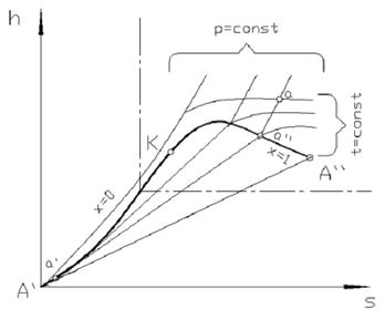Состояние воды в тройной точке (s 0 = 0; Т 0 = 273,16 К) изображается в диаграмме (рис. 4.6) точкой А. Откладывая на диаграмме для разных температур значения s¢ и s ², получим нижнюю и верхнюю пограничные кривые. Влево от нижней пограничной кривой располагается область жидкости, между пограничными кривыми – двухфазная область влажного насыщенного пара, вправо и вверх от верхней пограничной кривой – область перегретого пара. На диаграмму наносят изобары. При р = const Иногда на T, s - диаграмме наносят линии х = const (рис. 4.6). Область диаграммы, лежащая ниже изотермы Т = 273 К, отвечающая различным состояниям смеси пар + лед, обычно не строится. h, s - диаграмма (рис 4.7). Она широко применяется для расчета процессов в паросиловых двигателях. За начало координат принято состояние воды в тройной точке. Откладывая на диаграмме для различных давлений значения s ¢ и h ¢ для воды при температуре кипения, а также s ² и h ² для сухого насыщенного пара, получаем нижнюю и верхнюю пограничные кривые.