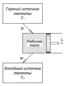 Несмотря на эквивалентность теплоты и работы, процессы их взаимного превращения неоднозначны. Опыт показывает, что механическая энергия может быть полностью превращена в теплоту, например, путем трения, однако теплоту полностью превратить в механическую энергию в периодически повторяющемся процессе нельзя. Многолетние попытки осуществить такой процесс не увенчались успехом. Это связано с существованием фундаментального закона природы, называемого вторым законом термодинамики. Чтобы выяснить его сущность применительно к тепловому двигателю, обратимся к принципиальной схеме этого двигателя (рис. 6.1).