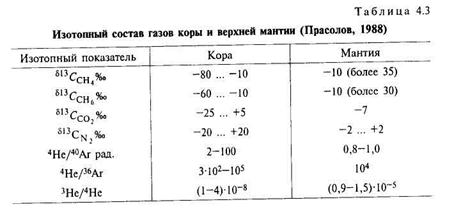 Согласно реакции Фишера-Тропша, при разных условиях могут быть образованы н-алканы, олефины, в незначительных количествах — изоалканы и ароматические УВ, но ни изопренои-ды, ни нафтены, широко распространенные во всех природных нефтях, таким путем синтезированы не были. В природе встречаются указанные металлы и алюмосиликаты, в природных газах присутствуют водород и окислы углерода, источником водорода может быть и вода, т.е. теоретически синтез УВ в природных условиях по реакции Фишера-Тропша возможен. Правда, природные газовые смеси далеки от необходимых для образования УВ стехиометрических соотношений, кроме того, смеси могут содержать примеси, например сернистых и азотистых соединений, являющихся ядами для металлических катализаторов синтеза УВ. Таким образом, образование УВ путем синтеза СО и Н2 протекает на чистых катализаторах (кобальт, никель, палладий и другие металлы VIII группы) в восстановленном виде при повышенных температурах и давлениях, а главное, что для нее необходимо строго нормированное соотношение компонентов системы, что в природных условиях вряд ли имеет место. В пользу доказательства эндогенного происхождения УВ природных газов часто используется повышенная концентрация в них гелия и водорода, хотя их присутствие еще не является показателем глубинного источника. Для установления связей газов с конкретными источниками необходимы четкие генетические метки в самих газах. В качестве критериев генезиса газов часто используется их изотопный состав. В табл. 4.3 приведены изотопные характеристики, присущие газам земной коры и мантии. Как видно, приведенные значения для большинства газов не однозначны. Единственным газом, изотопный состав которого в мантийном и коровом резервуарах резко различен, является гелий. Содержание 3Не в современном мантийном гелии в 1000 раз больше, чем в чисто радиогенном, коровом. В качестве индикатора мантийной компоненты в подземных флюидах используется отношение концентраций 3Не/4Не, обозначаемое буквой R. В коровом радиогенном гелии R = 10-8, а в объектах, связанных с дегазацией мантии, R = 10-5. Наличие ювенильной примеси гелия позволяет оценить и возможную долю углеродсодержаших газов, и прежде всего мета- на, мантийного генезиса. Эта оценка была проведена двумя независимыми способами Э.М. Прасоловым, И.Н. Тостихиным (1987) и Б.Г. Поляком с соавт. (1996) расчетным способом, основанным на балансе этих газов в «недиссипирующей» атмосфере, и эмпирическим — на основе многочисленных изотопных исследований фумарольных газов, срединно-океанических систем. Установлено, что в современной мантии соотношение СН4/3Не = 106.
