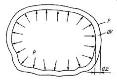 Однако ниже по мере расшифровки физического смысла введенных понятий станет ясно, что во всех случаях положительному dU отвечают положительные dQ и dE. Причина кажущегося исключения для механических явлений заключена толь ко в неадекватном способе традиционного выбора механического экстенсора, то есть объема V (см. параграфы 2 и 4 гл. XV). Кстати, на примере механической работы легко показать органическую связь, существующую между уравнениями (28) и (43) и таким образом перекинуть мост к общему уравнению (34). Для этого достаточно обратиться к рис. 1, где изображена система, изменившая свой объем на величину dV под действием давления р; площадь контрольной поверхности равна F.