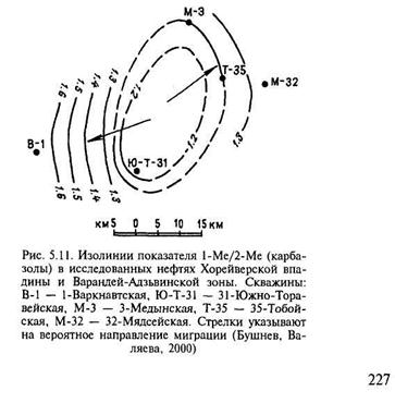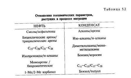 Направление миграции (расстояние около 20 км) в двух направлениях также устанавливается по характеру распределения бензо-карбазолов. Намеченное по карбазолам положение очага генерации совпадает с положением зоны прогибания — Морейюской депрессии. Из приведенных примеров видно, что соотношение изомеров метилзамещенных производных карбазолов является достаточно надежным показателем латеральной миграции. Как было отмечено выше, различные геохимические показатели в результате разного направления миграции изменяются не всегда однозначно, а некоторые из них разнонаправленно (например, ЦГ/ЦП) при вертикальной и латеральной миграции. Поэтому при рассмотрении характера изменения каких-то геохимических параметров нефтей для установления направленности миграции необходимо рассматривать более широкий круг геохимических вопросов — генетические показатели, корреляцию нефть-НМ-порода и др., а главное — необходимо их увязывать с конкретной геологической ситуацией. Но, несмотря на неодназначность изменений отдельных геохимических показателей, существуют геохимические параметры одно направленно изменяющиеся в процессе миграции, причем они различны для нефти и конденсата (табл. 5.2). Установления более широкого и информативного комплекса геохимических параметров—показателей миграции — задача современной резервуарной геохимии.