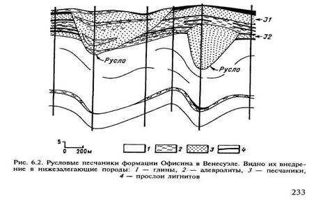 Наиболее крупную группу образуют резервуары, литологически ограниченные со всех сторон. В наиболее простом случае это песчаная линза в глинистой толще или какой-то участок повышенной трещиноватости или кавернозности в массиве осадочных или изверженных пород. Другим примером является погребенная речная долина, выполненная песчано-алевритовыми аллювиальными осадками (см. рис. 6.1, г, д). Аллювиальные отложения имеют существенное значение как природные резервуары для нефти и газа в том случае, когда они сохраняются в ископаемом состоянии. Речным отложениям обычно свойственна форма вытянутых, нередко извилистых тел. Различаются отложения русел, прирусловых отмелей и валов, пойм. При усилении течения на дне реки образуются крупные промоины, заполняемые относительно более грубым материалом. Заполнение русла может происходить в разных условиях как при непрерывном, так и прерывистом процессе, как при врезе реки в уже уплотнившиеся породы, так и в мягкие, в том числе пластичные глинистые осадки. При непрерывном заполнении русла, врезанного в плотные породы, накопившиеся отложения в поперечном разрезе характеризуются плоской сверху и выпуклой книзу формой, которая сохраняется даже при накоплении значительной мощности перекрывающих осадков. Вверх по разрезу размер зерен постепенно уменьшается от грубых (с включениями гравия и гальки) до алевритовых. Тело заполнения может слагаться как косослоистыми, так и горизонтальнослоистыми песчаниками. Степень сортированности песчаного материала варьирует по разрезу. В песчаниках могут присутствовать прослои и линзы глин. Если русловая долина врезается в еще неуплотненные породы, то при последующем погружении и росте нагрузки проявля-