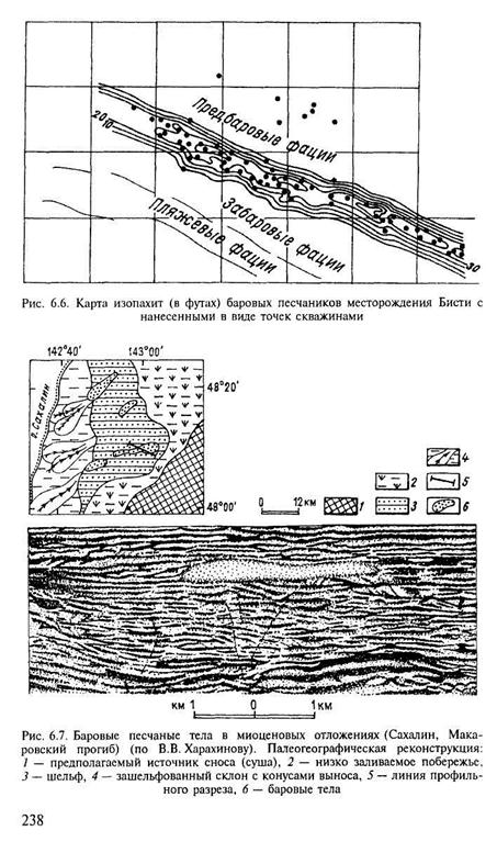 Некоторые пляжи сложены перетертыми обломками раковин или известковыми оолитами, они очень быстро цементируются, и возникают бичроки. Гряды, сложенные пляжевыми песками, образуют мощные системы вдоль морских побережий, это хорошо видно на примере Мексиканского залива (рис. 6.5). В соответствии с конфигурацией береговой линии полоса пляжа может изгибаться и прерываться. Вдоль берега протягиваются и гряды подводных баров. Сильные штормы разрушают, а затем вновь формируют бары так, что материал здесь хорошо сортируется. Прибрежные бары, представляющие собой иногда барьерные острова, развиты почти на всех мелководьях. Вытянутые цепи песчаных островов часто отделяют от моря (озера) лагуны. Если эти песчаные острова причленяются к выступающей части суши, они имеют вид кос, иногда отгораживающих бухты, в которые впадают реки. Обращенный к морю край бара (барьерного острова) обычно сглаженный, ровный, а противоположный внутренний край более неровный. Гидродинамические и гидрохимические характеристики водной среды часто различаются на противоположных сторонах этих островов. Бары образуются в результате совместного действия намывных приливных и вдольбереговых течений, разносящих материал. Для формирования баров нужен некоторый избыток приносимого материала. Современные бары широко известны. Ископаемые бары являются резервуарами нефти и газа. Хорошо изучен баровый комплекс Бисти позднеме-лового времени в бассейне Сан-Хуан в США (рис. 6.6). Здесь выделяются предбаровые, баровые и забаровые фации. Предбаровые фации месторождения Бисти представлены глинами с остатками фауны открытого моря, баровые — глауконитовыми песчаниками, забаровые — песчанистыми глинами и глинистыми песками с небольшим количеством доломита. Месторождение Бисти, расположенное в бассейне Сан-Хуан, представляет собой пример хорошо изученного древнего бара, протягивающегося более чем на 50 км при ширине около 1 км. Это песчаники верхнего мела, которые образовались в бассейне Сан-Хуан, представлявшим в то время отгороженный залив моря, покрывавшего территорию современного Западного внутреннего бассейна. Другой пример ба-ровых тел (рис. 6.7) представлен палеогеографической схемой, на которой выделены баровые тела в миоценовых отложениях на юго-восточном шельфе Сахалина и на сейсмическом профиле, где выделяется одно из этих тел. Баровые отложения часто характеризуются высокими фильтрационно-емкостными свойствами. Выклинивание пластов является одним из типов ограничения природных резервуаров (и предпосылкой возникновения ловушек для углеводородов). Примером этого служат заливообразные линии выклинивания песчаников олигоценового возраста (майкоп-