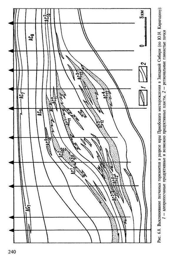 екая серия) на северном склоне Кавказа в Краснодарском крае. Выклинивание и замещение линзообразных пластов песчаников и алевролитов глинами на склонах бассейна хорошо видны на примере Приобского месторождения в Западной Сибири (рис. 6.8). На шельфе иногда перемещаются большие массы обломочного материала особенно во время сильных штормов, происходят размыв и переотложение осадков. Ширина этой шельфовой зоны может быть очень значительна. При слабом наклоне дна и даже незначительных колебаниях уровня моря перемещение береговой линии достигает больших масштабов, и однородный характер переработки материала выдерживается на обширных площадях — формируются протяженные пласты, для них характерна выдержанная параллельная и слабоволнистая слоистость. Во внешней части шельфа гидродинамическая активность в целом убывает, хотя струи течений продолжают действовать. Перенос материала здесь осуществляется преимущественно во взвешенном состоянии, среди осадков преобладают мелкозернистые разности, увеличивается количество глинистого вещества. Текстуры осадков преимущественно тонкослоистые. Развитие терригенных коллекторов здесь прежде всего связано с зонами морских течений. Песчано-алевритовые породы в этих условиях более надежно изолированы глинами, чем на внутреннем шельфе. Примером резервуаров с высокими свойствами служат газоносные песчаники хадумского горизонта палеогена на Ставрополье. Континентально-склоновые отложения также выступают в роли природных резервуаров. Для формирования отложений в каньонах и глубоководных конусах выноса большую роль играет гравитационный фактор во время действия скоростных мутьевых потоков на подводных склонах. Подводные каньоны, врезаясь в континентальный склон, а часто и в шельф, переносят материал к основанию склона, где он и скапливается, образуя глубоководный конус выноса (фэн). Ниже устьев крупных рек конусы могут образовать единую систему с их дельтами. В верхней части конус имеет активное (для данного момента) питающее русло, которое ниже разветвляется на протоки (как и в дельте). Русло и особенно протоки часто ограничены прирусловыми валами. Конус подразделяется на три части: 1) верхнюю с центральным руслом, 2) среднюю (средний конус или «супрафэн»), сложенную лопастями, образовавшимися в результате переноса материала по отдельным протокам в разное время, поэтому они частично могут перекрывать друг друга (средний конус имеет наиболее выпуклую поверхность и выражен в рельефе дна), 3) для нижней части характерна выровненная поверхность, рассеченная мелкими разветвляющимися протоками. В целом конус напоминает дерево, опрокинутое кроной вниз. В наиболее проточных частях конусов