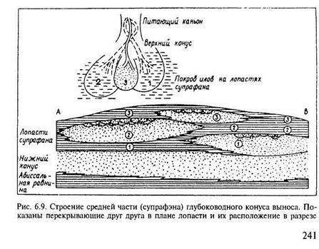 материал бывает хорошо промыт. В прирусловых валах песчаный материал более мелкий и обогащен глиной. Межрусловые участки долин характеризуются накоплением только мелких осадков из взвеси в воде в результате медленного осаждения, которые в период спокойного развития покрывают весь фэн. Средняя часть глубоководного конуса выноса (или супрафэн) является активным полем осадконакопления. Обилие осадков иногда формирует выпуклую поверхность дна, рассеченную многочисленными руслами, разветвляющимися на протоки и ограниченные иногда прирусловыми валами. Среди русел выделяются действующие и уже отмершие, покрытые слоем пелагических илов. В целом супрафэн представляет совокупность веерообразных лопастей, накопившихся в разное время. В поперечном разрезе они представляют линзы более грубого материала среди глинистых осадков (рис. 6.9). Супрафэн представляет собой как бы подводную дельту, в линзах отмечается погрубение материала вверх по разрезу. В нижней части супрафэна русла постепенно исчезают, и к его нижней границе пески почти выклиниваются вниз по падению. Песчаные фации средней части фэна могут соединяться с песками питающей долины верхней части и образовать единый достаточно мощный песчаный резервуар сложной разветвленной формы. Нижняя часть глубоководного конуса обычно бывает самая большая по площади развития. Вместе с супрафэном она образует подножие континентального склона в океанах и глубоковод-