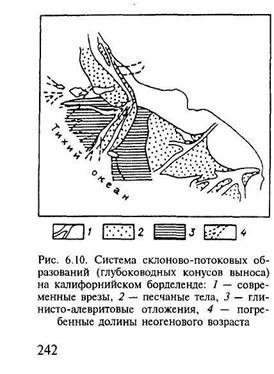 ных морях. Поверхность дна здесь пологоволнистая, рассечена слабоврезанными мелкими руслами. Здесь господствуют уже чисто пелагические условия осадкообразования и может отлагаться повышенное количество ОВ. В периоды усиления поступления материала с верхних этажей сюда проникают турбидитовые течения, они растекаются из русел и в периферийной части конуса текут уже широким фронтом. Среди турбидитов преобладают тонкослоистые разности глинистого и алевритового материала, много растительного детритуса. В периоды сильных импульсов образуются плащеобразные покровы мелкопесчаного материала, в котором может быть видна градационная слоистость. Фации нижнего конуса постепенно переходят в фации абиссальных равнин. В процессе роста и продвижения глубоководных конусов от берега в океан (море) отложения средней, а затем и верхней части накладываются на нижний конус, и образуется стратифицированный разрез с общим укрупнением материала кверху. Процессы перемещения и накопления осадочного материала в глубоководных конусах чутко реагируют на колебания уровня океанического (морского) бассейна, а также изменение объема твердого стока, поступающего из источника питания. При низком уровне стояния в русла с континента приносится более грубый материал. Повышение уровня в океане отражается в заполнении русел конусов глинистыми илами. Ранее сформированное песчаное тело перекрывается ими. Если материала поступает много, то конусы расширяются, сливаются между собой и могут образовать почти непрерывную полосу на континентальном склоне. Подобную ситуацию можно видеть на крутом континентальном склоне (бордер-ленде) штата Калифорния в США (рис. 6.10). В различных нефтегазоносных комплексах могут преобладать те или иные разновидности природных резервуаров. Например, на широких шельфах эпиконтинентальных морей будут образовываться в основном пластовые резервуары, а для озер-но-речных равнин харак- терны резервуары линзовидной формы и другие ограниченные по распространению разновидности. В мощных песчаных свитах возникают условия существования массивных резервуаров. Последние больше характерны для карбонатных пород, нефтегазо-носность которых широко известна. В них находятся очень крупные и даже уникальные скопления углеводородов (особенно в районе Прикаспия, Персидского и Мексиканского заливов). Наиболее распространены рифогенные известняки, образующие выпуклые тела, которые имеют общее название биогермы. Состав рифостроителей, т.е. организмов, скелеты которых образуют биогермы, разнообразен: коралловые полипы, мшанки, различные двустворки. Биогермы пластовой формы образованы карбонатами, замещающими водоросли в местах их массового расселения. Такие тела называются строматолитами. Среди карбонатных комплексов наиболее крупные скопления углеводородов приурочены к тем из них, которые содержат рифогенные тела. Внутреннее строение рифовых массивов сложное. Сами рифовые тела резко выделяются в рельефе поверхности комплекса. Относительное превышение вершин массивов может достигать 1—2 км. В целом риф является резервуаром массивного типа, но внутри него зоны отличаются друг от друга. Это прежде всего ядро рифового массива, его склоны, сложенные скелетными остатками разных организмов. Кроме того, выделяется так называемы