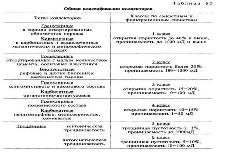 три типа пустотности: трещинная, трешинно-каверновая и поро-вая. Основной объем пустот в магматическом коллекторе принадлежит микротрещинам и микрокавернам. Основное пустотное пространство тектонического происхождения связано с трещино-ватостью, катаклазированием и милонитизацией, в результате чего породы раздроблены в щебенку. Контракпионная усадка при остывании привела к созданию контракционной пустотности. Пористость пород в большинстве случаев не превышает 10-11%. Проницаемость матрицы невысока, но в результате развития кавернозности и трешиноватости в целом проницаемость достигает сотен миллидарси. Зоны улучшенных коллекторов обеспечивают притоки нефти в сотни тонн. В качестве газосодержащих выделяются многолетнемерзлые породы. Пустоты разного генезиса, образовавшиеся в них, могут быть заполнены газом, льдом и незамерзшей водой. При определенных условиях (повышение давления) образуются соединения газа с водой — газогидраты. Выбросы газа из этих толщ могут отличаться высокой интенсивностью и большими дебитами (в основном не столь длительными). Залежи в этих коллекторах располагаются на небольших глубинах, в некоторых случаях они могут быть использованы для местных нужд. Учитывая необходимость сопоставления основных параметров двух ведущих групп коллекторов — обломочных (гранулярных) и карбонатных, — авторы предлагают общую классификацию этих коллекторов (табл. 6.5). Она основана на сопоставлении исходных классификаций, в ней учтены как структурные признаки породы, так отчасти и их состав. Выделение классов производится в основном по величине открытой пористости, при этом ее границы, а также проницаемость в классах очень широкие (соответственно 10-20%, 100-1000 мД). Этот недостаток может быть ликвидирован введением подклассов в зависимости от развития конкретных разностей пород в том или ином районе со свойственными им вещественно-структурными характеристиками и параметрами. Например, в классе 2 можно выделять подкласс 2а с хорошо отсортированными малоцементными песчаниками и 26 — с песчаниками, содержащими повышенное количество цемента и соответственно со сниженной емкостью и особенно проницаемостью. В классе 4 слабо измененные пелитоморфные и мелкозернистые известняки имеют удовлетворительную емкость, но низкую проницаемость. Сюда же могут быть отнесены комковатые выщелоченные известняки или строматолитовые, обладающие повышенными свойствами. Укрупненные классы полезны для выявления общих тенденций изменения свойств на значительных площадях и частях разреза.