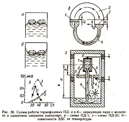 Теперь можно приступить к описанию различных реально действующих циркуляционных вечных двигателей второго рода (ПД). Первый из них основан на использовании процессов фазовых превращений - испарения жидкости и конденсации пара. Принято считать, что эти процессы подчиняются теории Томсона-Кельвина. Однако детальный теоретический и экспериментальный анализ с позиций ОТ покажет, что это не соответствует действительности, и поможет нам создать соответствующие фазовые ПД. Рассмотрим этот вопрос более подробно. Хорошо известно уравнение Томсона-Кельвина (1871 г.), определяющее давление насыщенного пара над искривленной поверхностью жидкости. Согласно этому уравнению, давление над выпуклым мениском должно быть выше, а над вогнутым - ниже, чем над плоским (в справочниках обычно приводится давление насыщенного пара над плоским мениском, оно принимается за основу и считается равным 100%). Это значит, что в среде с давлением насыщенного пара 100% в несмачиваемом капилляре жидкость, имеющая выпуклый мениск, должна испаряться, а в смачиваемом, наоборот, благодаря вогнутому мениску конденсироваться. Другими словами, если принять за основу теорию Томсона-Кельвина, то надо признать, что в закрытом сверху несмачиваемом жидкостью капилляре достаточно большого диаметра давление пара по краям мениска должно быть выше, чем в средней плоской части, где оно равно 100%. В результате жидкость должна самопроизвольно испаряться с краю и конденсироваться в середине, то есть должна возникать вечная в целом бездиссипативная макроскопическая непрерывная циркуляция жидкости и пара, показанная на рис. 30, а [21, с.335]. В смачиваемом жидкостью капилляре циркуляция должна иметь обратное направление. Оба вида циркуляции суть необходимые следствия уравнения Томсона-Кельвина, которое выведено из второго закона термодинамики. С другой стороны, подобная циркуляция категорически запрещена самим вторым законом - это первое противоречие в существующей теории фазовых превращений, которое достойно быть упомянутым. Второе, еще более разительное противоречие заключается в следующем. В работах [26, 30] показано, что процесс испарения разыгрывается в тончайшем поверхностном слое жидкости, охватывающем по толщине всего несколько молекул. Поэтому физический механизм этого процесса должен целиком определяться термодинамическими условиями (температурой, давлением и т.д.) и практически не зависеть, вопреки уравнению Томсона-Кельвина, от кривизны мениска, если только радиус кривизны много больше размеров молекулы испаряющейся жидкости. Задать термодинамические условия - значит задать конкретную паропроизводительность элемента площади поверхности любого мениска (выпуклого, плоского или вогнутого). При данной паропроизводительности элемента парциальное давление пара должно определяться суммарной площадью всех элементов, заключенных в рассматриваемом объеме.