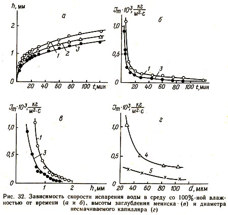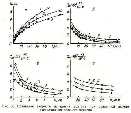 Из рис, 31-37 видно, что общий характер закономерное гей испарения из смачиваемых и несмачиваемых капилляров остается одинаковым для различных жидкостей и уровней относительного расположения капилляра и чаши с плоским мениском. Скорость испарения заметно больше у жидкостей с повышенным давлением насыщенного пара, при этом уровень плоского мениска играет меньшую роль, хотя на рис. 37, в вода при больших заглублениях мениска в капилляре начинает конкурировать со спиртом. Во всех случаях максимальная скорость испарения наблюдается в начальный момент, поэтому смачиваемые капилляры предпочтительнее несмачиваемых, ибо у первых испарение всегда происходи г на конце капилляра, где заглубление мениска равно нулю. Скорость испарения определяет паропроизводительность, а следовательно, и разность парциальных давлений пара между искривленным и плоским менисками; эта разность есть рабочее давление, под действием которого самофункционирует ПД [ТРП, стр.450-459].