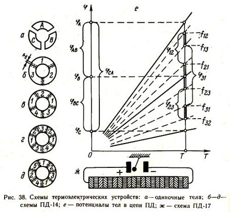 Как видим, потенциал тела j является некоторой функцией f температуры и электрического заряда (или потенциала). Для нас сейчас важна температурная зависимость потенциала. Согласно уравнению (336), потенциал разнородных тел изменяется с температурой не одинаково, так как у них различны коэффициенты состояния А. Именно это является причиной возникновения разностей потенциалов Вольта и служит основанием для вывода из ОТ закона Вольта. Например, у трех одиночных тел, обозначенных на рис. 38, а буквами А, В и С, зависимость потенциала от температуры условно изображена сплошными линиями (рис. 38, е); при одной и той же температуре Т эти тела имеют некие вполне определенные вольтовские, постоянные при данной температуре потенциалы jА, jВ и jС, никак между собою не связанные и друг от друга не зависящие. Разности потенциалов между телами, обозначенные двойными индексами, как видно из рисунка, в сумме всегда составляют нуль, то есть jАВ + jВС + jСА = jА - jВ + jВ - jС + jС - jА = 0 (337) где jАВ = jА - jВ; jВС = jВ - jС; jСА = jС - jА (338) В этом фактически и заключается суть закона Вольта; соответствующий вывод может быть сделан для любого числа тел. Однако если тела привести в соприкосновение друг с другом (рис. 38, б), то вольтовская идиллия несколько нарушается. Это объясняется тем, что скачки потенциалов возникают между пристеночными слоями х, имеющими толщину порядка размеров нескольких атомов. Термодинамические свойства каждого такого слоя заметно изменяются в зависимости от того, с каким конкретно другим телом соприкасается данное: вакуумом, воздухом, диэлектриком, полупроводником, металлом и т.п. При этом изменяются коэффициенты состояния А, а значит, и функции f. Новые функции f для контактирующих поверхностей (слоев х) изображены на рис. 38, е штриховыми линиями. В условиях контакта при температуре Т тело 1 уже не имеет прежнего потенциала jА: на поверхности соприкосновения с телом 2 оно обладает потенциалом f12 (первый индекс соответствует номеру данного тела, второй - номеру тела, с которым соприкасается данное), а на поверхности соприкосновения с телом 3 - потенциалом f13. Такие же изменения потенциала наблюдаются и у других тел. В результате получаются новые скачки потенциалов f12, f23 и f31, отличные от вольтовских jАВ, jВС и jСА. Эти новые скачки в сумме могут и не быть равны нулю, что нарушает закон Вольта. Как видим, причина нарушения закона Вольта кроется во взаимном влиянии, взаимодействии контактирующих тел, которое законом не предусматривается. Благодаря нарушению закона Вольта в замкнутой цепи появляются нескомпенсированная ЭДС и электрический ток, в итоге цепь превращается в вечный двигатель второго рода со всеми вытекающими отсюда последствиями. Остановимся на изложении теории этого вопроса несколько подробнее [7, 8, 10] [ТРП, стр.462-465].