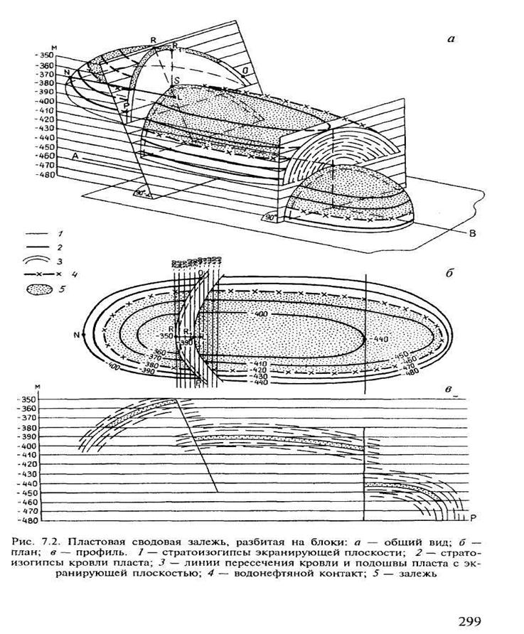 обусловленное влиянием эрозии в период отсутствия осадкона-копления. Иногда в таких ловушках наблюдается обратная зависимость — ухудшение коллекторских свойств при приближении к поверхности несогласия в результате заполнения пустот верхней части ловушки минеральным веществом, выпавшим из циркулировавших здесь вод. Залежи нефти и газа, экранированные или запечатанные асфальтом, по мнению И.О. Брода, также относятся к этому виду залежей, поскольку они сохранились благодаря асфальтовой пробке, образовавшейся вследствие окисления нефти в период подъема и эрозии. По времени же формирования они различны. Обычные стратиграфически экранированные ловушки и залежи формируются после перекрытия пласта коллектора несогласно залегающей непроницаемой толшей, в то время как запечатывание асфальтом происходит в период эрозии, т.е. залежь к моменту формирования несогласия, видимо, уже существовала. Залежи, связанные с запечатыванием асфальтом, В.Б. Оленин также выделил в самостоятельный вид в группе ловушек экранирования. Цитологически экранированные залежи приурочены к ловушкам, экраном которых служат литологические замещения и выклинивания пластов коллекторов. Формирование таких ловушек обусловлено литологическим ограничением коллекторского пласта природного резервуара в результате его выклинивания или фа-циального замещения одновозрастными плохопроницаемыми отложениями. Экранирование такого типа происходит по восстанию пластов и связано с замещением песчаных пластов глинистыми (см. рис. 7.3, д). Закономерной чертой ловушек, возникших за счет замещения коллекторов природного резервуара плохопроницаемыми отложениями, является постепенное ухудшение пористости и проницаемости коллекторской части по мере непосредственного приближения к поверхности выклинивания. Ловушки этого вида возникают в прибрежно-морских толщах в условиях частой смены уровня моря. Классическим примером подобных залежей являются литологически экранированные залежи нефти в майкопской толще Предавказья (месторождения Восковая гора, Асфальтовая гора др.). 2. Группа массивных залежей связана с массивными природными резервуарами, ограниченными непроницаемой покрышкой только сверху. Движение флюидов в них происходит преимущественно в вертикальном направлении. Отличительная черта массивных залежей — гидродинамическая связь всех частей залежи, несмотря на различие емкостно-фильтрационных свойств и присутствие разделов и, соответственно, единство зеркала водо-нефтя-ного или газоводяного контакта в пределах всего выступа (хотя этот признак не является определяющим) (см. рис. 7.3, е, ж, з). По генезису ловушек массивные залежи делятся на три подгруппы: в структурных, эрозионных и биогенных выступах. Залежи в структурных выступах связаны с ловушками тектонического происхождения. Структурные выступы представляют собой антиклинальные складки (см. рис. 7.3, е) или структурные выступы горстового характера (рис. 7.7). Массивные залежи, связанные с антиклинальными складками, широко распространены, особенно в платформенных областях. Массивные резервуары бывают литологически относительно однородные и неоднородные. Первые чаще связаны с карбонатными резервуарами (например, известняки турнейского яруса нижнего карбона Татарии, верхнего карбона и нижн