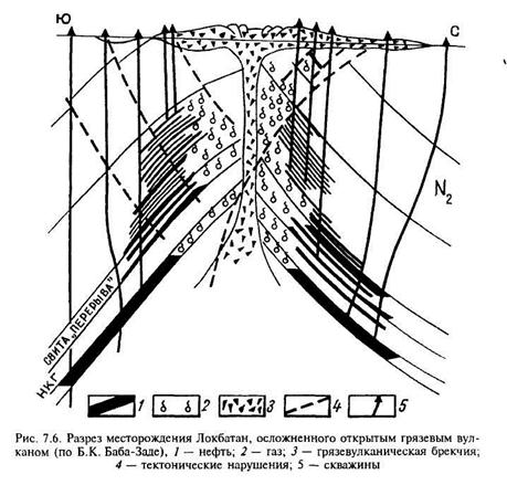 жению флюидов вверх по восстанию пласта. Экраны могут представлять собой поверхности тектонических нарушений, стратиграфических несогласий и литологических замещений. В зависимости от характера экрана выделяются залежи трех видов экранирования: тектонически экранированные, стратиграфически экранированные и литологически экранированные (см. рис. 7.3, б, в, г, д). Тектонически экранированные (дизъюнктивно экранированные) залежи формируются в том случае, если в результате дизъюнктивных дислокаций моноклинально залегающий пластовый резервуар приходит в соприкосновение с непроницаемыми породами (см. рис. 7.3, б). По генетической природе экраны могут быть сбросами, взбросами, надвигами и сдвигами. Разрывы являются также и путями миграции флюидов, один и тот же разрыв в разное время может выполнять разные функции — быть проводящим каналам в эпоху растяжения и быть экраном при сжатии. Тектонически экранированные залежи присутствуют как в платформенных, так и складчатых областях, но в последних они распространены значительно шире. Тектонические нарушения часто разбивают пластово-сводовые залежи. Некоторые исследователи называют подобные комбинированные залежи — пластово-сводовые тектонически экранированные (см. рис. 7.3, л). Примеры месторождений таких залежей приведены на рис. 7.4, в, г. Сложно построенные тектонически экранированные залежи характерны для краевых прогибов. На рис 7.5 приведен схематический разрез Бо-риславского месторождения нефти и газа Предкарпатского прогиба. Тектоническими экранами являются поверхности пологих надвигов, характерных для складчатых бортов краевых прогибов. Экранирование соляным штоком рассмотрено И.О. Бродом как частный случай тектонического экранирования, характерный для солянокупольных районов платформенных областей (см. рис. 7.3, в); экранирование жерлом грязевого вулкана (рис. 7.6) также является разновидностью тектонического экранирования, распространенной в складчатых областях с грязевулканической деятельностью. В.Б. Оленин выделяет два последних случая в качестве самостоятельных видов в группе ловушек экранирования. Стратиграфически экранированные залежи приурочены к ловушкам, формирование которых связано с несогласным перекрытием одной серии пластов плохопроницаемыми породами более молодой серии, т.е. породы пластового резервуара по поверхности несогласия контактируют с непроницаемой покрышкой (см. рис. 7.3, г). Обычно залежи формируются в ловушках стратиграфического экранирования в случае углового несогласия между контактирующими толщами. В подобных ловушках при приближении к поверхности несогласия, как правило, наблюдается улучшение коллекторских свойств природного резервуара,