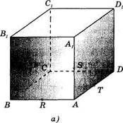 Если, по крайней мере, две точки многогранника лежат по разные стороны от плоскости, то говорят, что плоскость пересекает многогранник. В этом случае ее называют секущей плоскостью. Фигура, состоящая из всех точек, общих для многогранника и секущей плоскости, называется сечением многогранника данной плоскостью. На рисунке 27 изображены тетраэдр ABCD и секущая плоскость р. Точки Аи В лежат по разные стороны от секущей плоскости. Четырехугольник LMNK — сечение данного тетраэдра плоскостью |3. Чтобы построить сечение многогранника плоскостью, надо задать эту плоскость: указать три (не лежащие на одной прямой) точки, через которые проходит эта плоскость, или точку и прямую и т.д. Пример. Постройте сечение куба ABCDAlB1C1D1 плоскостью, проходящей через точки R,S,T — середины ребер АВ, AAlf AD (рис. 28, а).
